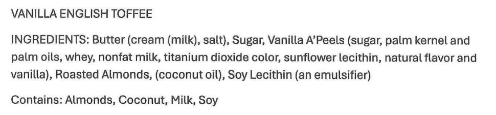 Immerse yourself in the simple yet sophisticated pleasures of our Vanilla English Toffee. This artisanal delight boasts a divine blend of rich vanilla flavor with a golden toffee, creating a symphony of flavors that dance on your palate. Elevate your snacking experience with the irresistible sweetness of this classic treat.